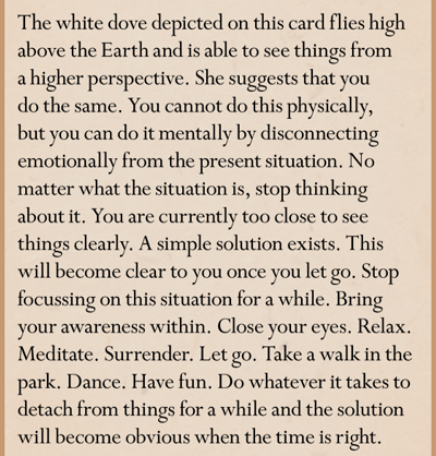 Affirmation: I surrender this situation to the Universal power of love. I trust that all is well in my life. I look at my life from a higher perspective. I am divinely guided. All is clear in my life – I am safe.