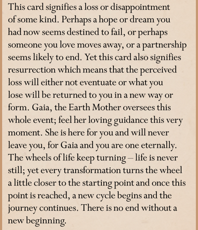 Affirmation: I give thanks for the healing that is taking place now in my life. I express all I feel honestly and lovingly, without fear or apprehension. I am safe – I am loved. I am one with the Goddess. I am one with the Earth and all creation.