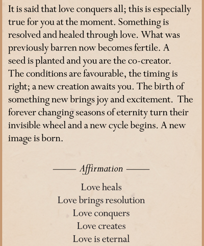 Affirmation: Love heals. Love brings resolution. Love conquers. Love creates. Love is eternal.
