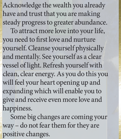 Affirmation: I receive clarity and direction as I enter a period of great focus and achievement. I stay true to myself and what I want. I remain positive, strong, and drive, and more abundance and opportunities come my way. I trust that the universe supports me as I follow my dreams, and I release the need to try to control outcomes. I make true progress when I follow my heart.