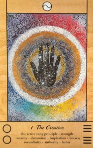 The Creative represents ultimate potential. It only manifests in an atmosphere of receptivity so charged that the quickening flash of inspiration can arc across it. In ancient China this potentiality, brimming on the point of being, was accorded the highest respect and was attributed to heaven. Known as the dragon power, it was depicted as an illuminated dragon continuously twisting in the darkness of the void. In the West it has been called the hand of God that creates all things. Because its very nature is the lack of a fixed form, the enormous energy of The Creative is undefinable. This is the primary active force that is spontaneous and unpredictable, untiring in a nature that is eternally in motion effecting change.
