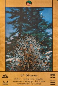 The message of Decrease implies the need to cut back, to acknowledge the importance – and the adequacy – of the bare essentials. While it is a pleasure to accumulate and comfortable to have more than you really need, once the comfort zone has grown excessive it becomes burdensome. Getting too cozy creates stagnation and defeats the drive to get out and explore new territories just as too much good cooking can make you fat, if you don’t energetically work it off. Always having everything you need right at your fingertips can create complacency, or downright laziness.